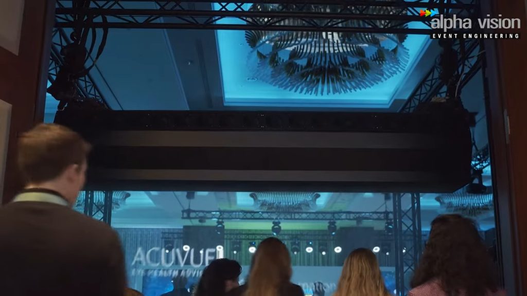 • Projektor (u nas dobierany w zakresie 12 000 – 15 000 ANSI lumenów, w zależności od jasności otoczenia) rzuca obraz na emitowaną mgłę; konstrukcja z czarnej kratownicy (sześcian) pozwala stabilnie zawiesić zarówno projektor, jak i sam ekran mgłowy. Obraz powstaje dzięki tylnej projekcji na cienkiej warstwie pary.