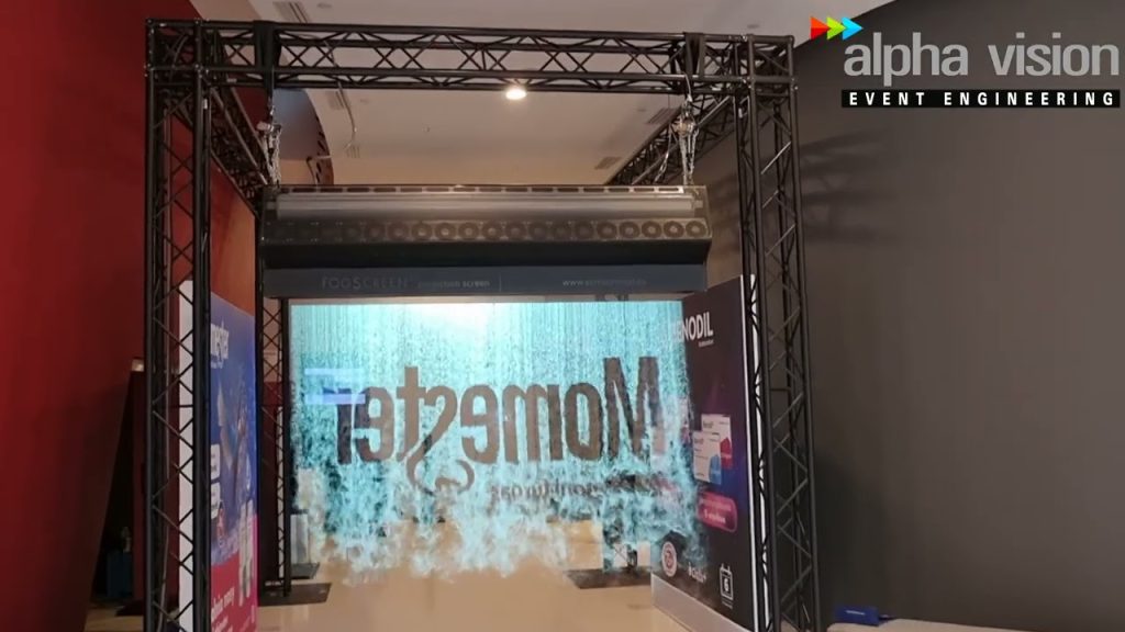 Nasze urządzenie ma 3 metry szerokości i montowane jest na estetycznej konstrukcji kratownicowej w formie sześcianu. Na górnej belce instalujemy projektor o jasności 12 000 – 15 000 ANSI lumenów (dobór w zależności od warunków otoczenia), a na drugiej belce umieszczony jest sam ekran mgłowy. Dzięki temu obraz projekcji jest wyraźny, dynamiczny i idealny nawet w wymagających warunkach oświetleniowych.
