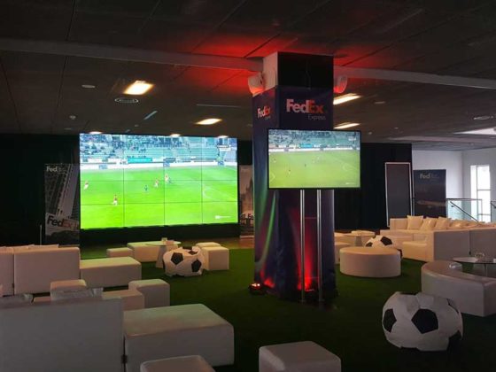 Na stadionie Legii Warszawa wyposażyliśmy w multimedia (ściany plasma wall / monitory LCD / nagłośnienie / oświetlenie) strefę kibica zaaranżowaną na potrzeby marki FedEX.